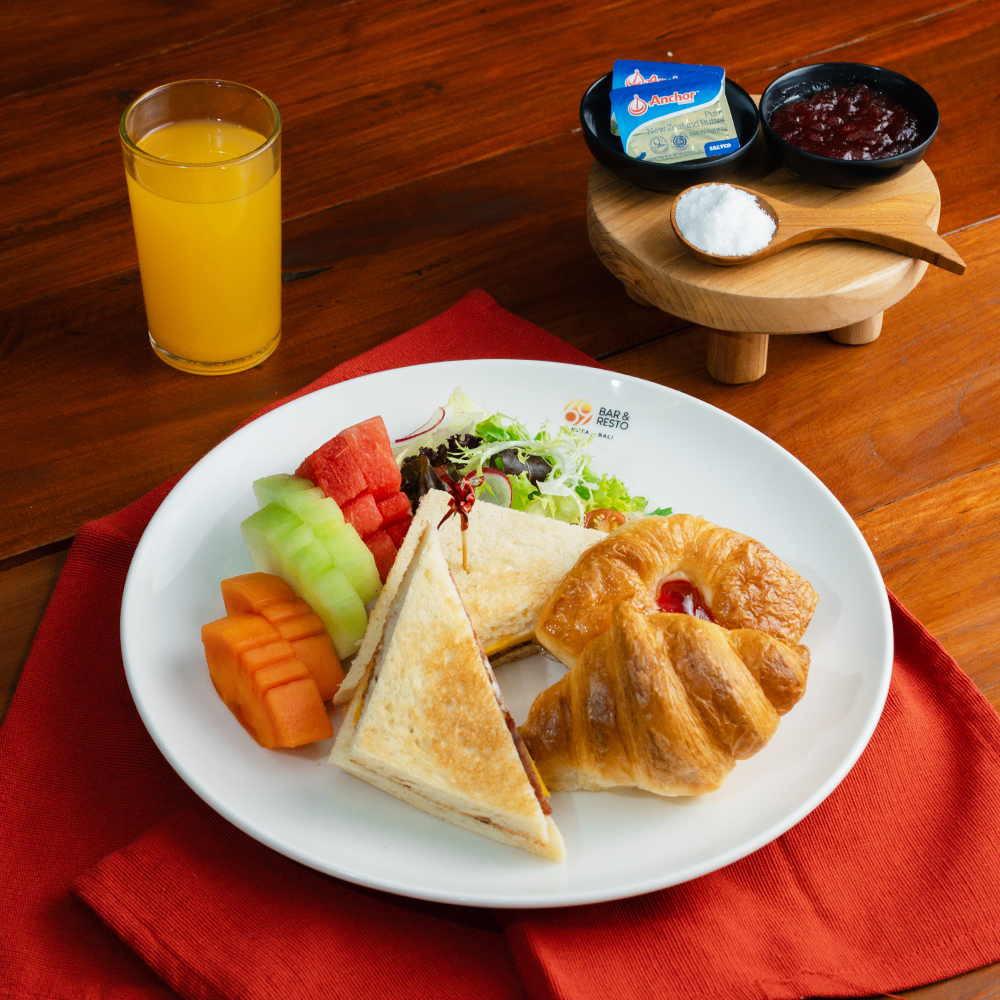 Club SandwichAll in one sandwich with homemade toast , chicken breast, egg, lettuce, tomato, cucumber, cheese, served with chips.IDR120.000